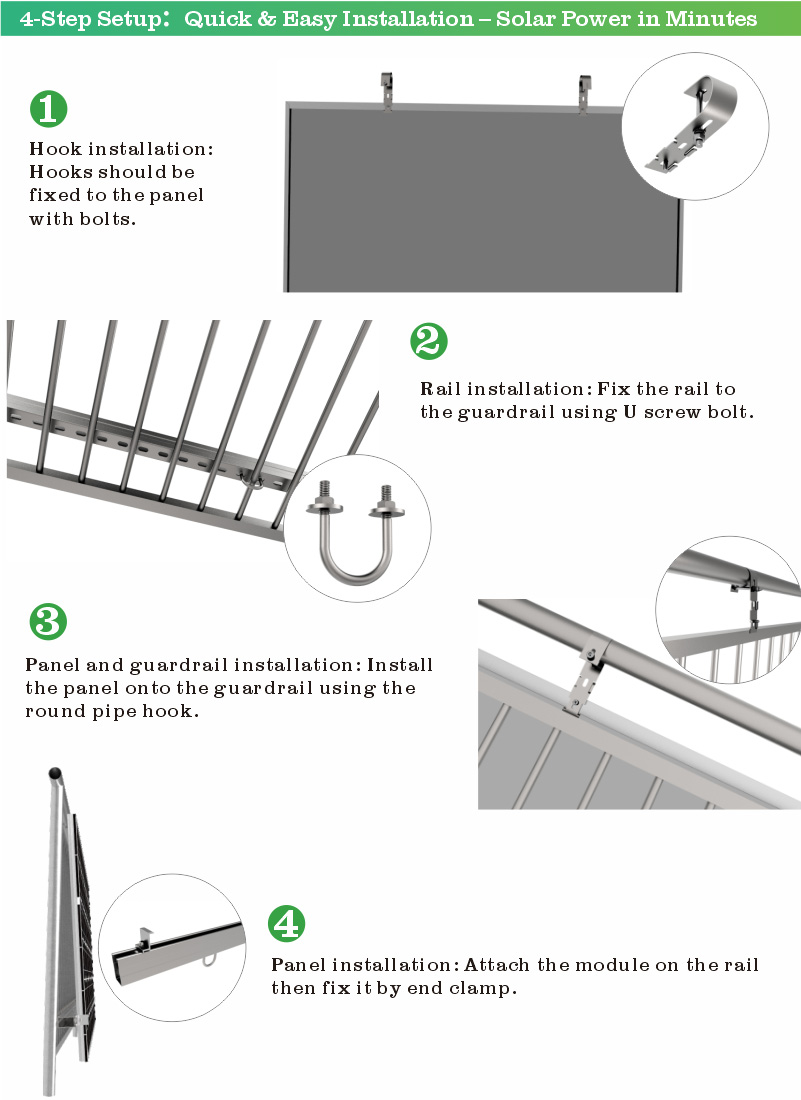 A: L-Fußsystem, Stehfalzsystem, Mini-Schienensystem, Hakensystem, Ballastsystem, BIPV-wasserdichtes System, Neigungswinkelsystem.